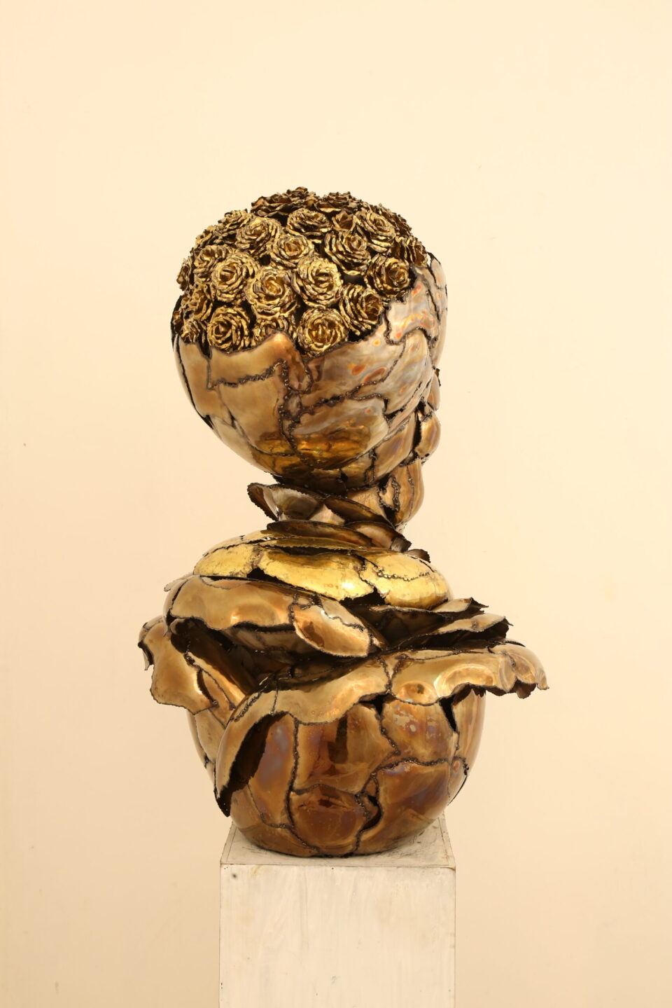Discover the mystery and wonder of Pioneering the genesis of life on earth The sculpture represents the concept of the "origination of life on earth." Drawing inspiration from the Panspermia theory, Kardashev scale, and Fermi paradox, this sculpture is a stunning representation of extraterritorial life and their involvement in sowing the seeds of existence on earth. The sculpture features an extraterritorial creature emerging from a bed of one rose. The creature's head is fixed with fifty seven fully bloomed roses, which serve as its brain. The symbolism behind the fifty seven roses is both complex and poignant, representing the complexity of life and the vast potential that lies within the universe. The extraterritorial creature itself is a testament to the wonder and mystery of the cosmos. Its form is simultaneously otherworldly and organic, suggesting that life may exist beyond our planet in forms that we can scarcely imagine. The creature's presence in the sculpture serves as a reminder of the vastness of the universe and the possibility that we are not alone. In many cultures, roses are associated with the concept of creation and birth. By using a single rose as the foundation for the sculpture, represent my belief that life on earth may have originated from extraterrestrial sources. This idea is in keeping with the Panspermia theory, which suggests that life may have been brought to earth by comets or other celestial bodies. Dimensions: 96cm x 63cm x 66cm Materials: Stainless Steel | Brass