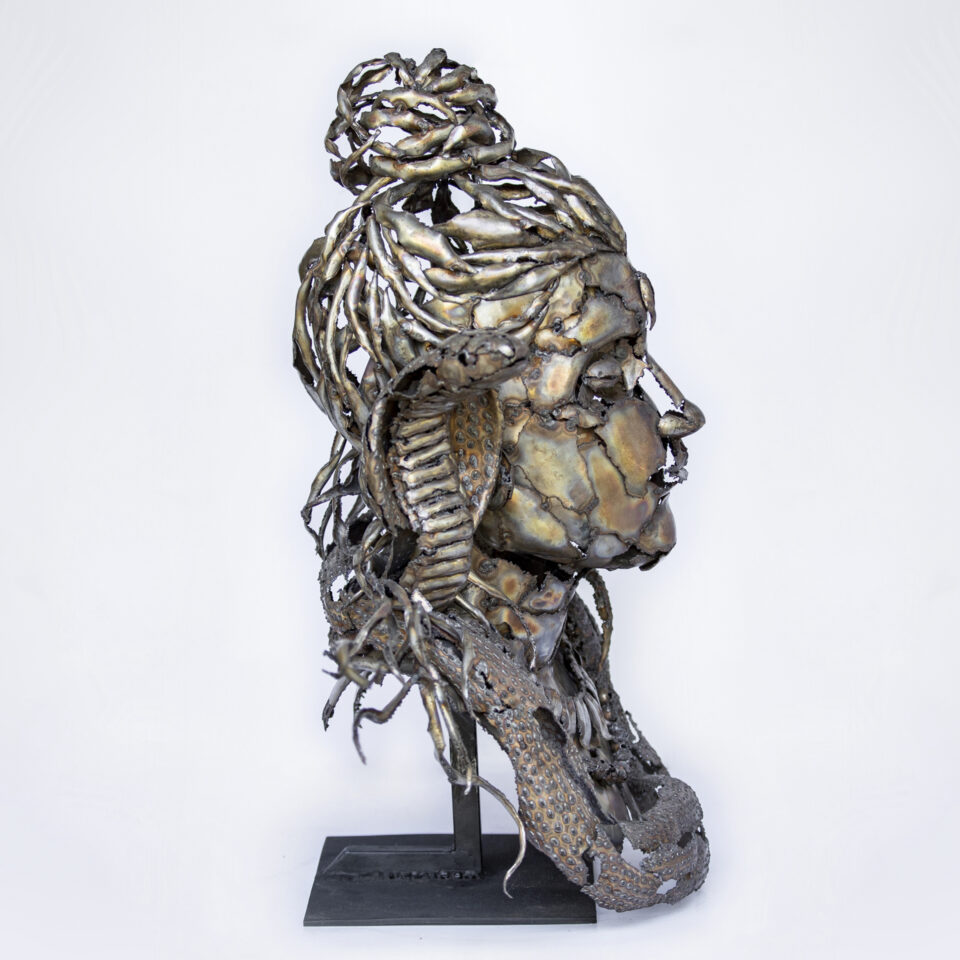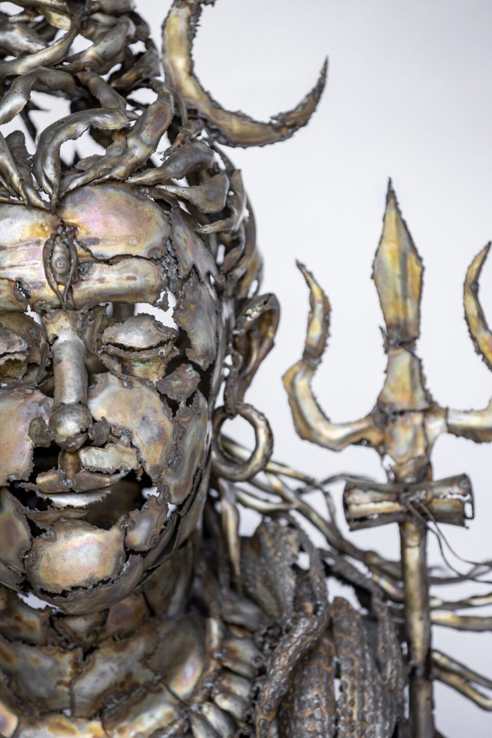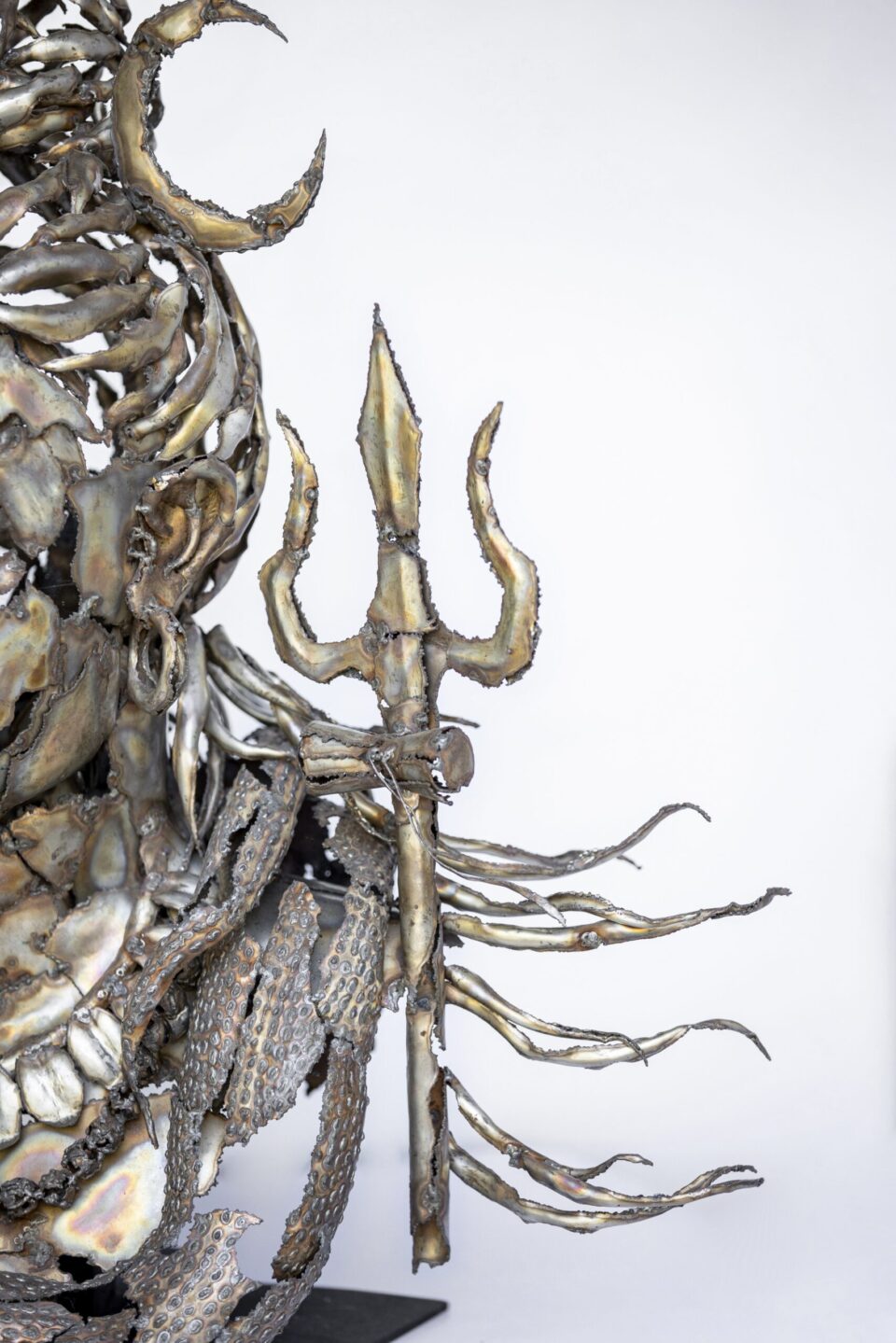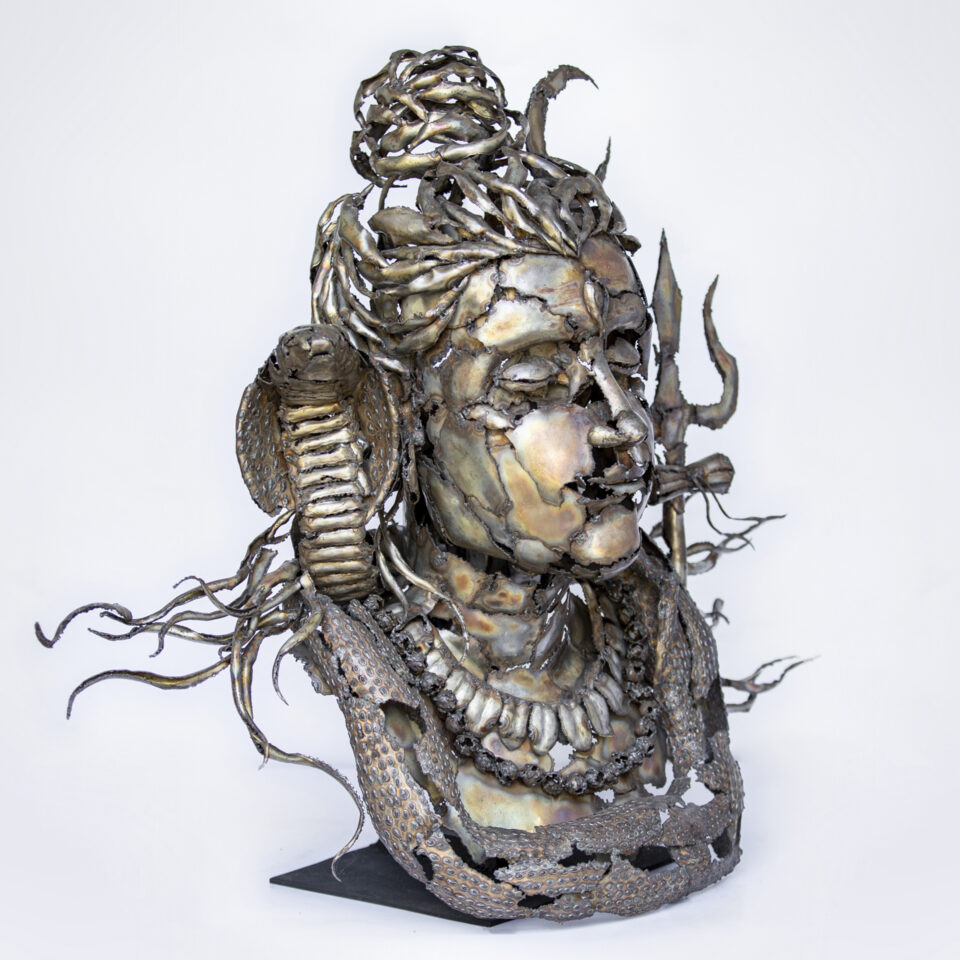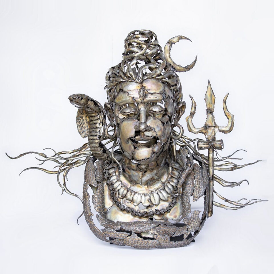 Mahadev, a contemporary sculpture of Lord Shiva, represents the role of the deity in Hindu mythology as the destroyer of the universe in order to re-create it. In Hinduism, Lord Shiva's powers of destruction and recreation are believed to be used to destroy the illusions and imperfections of the world, paving the way for beneficial change. The sculpture depicts Lord Shiva staying in a protective pose, with crack marks running along its surface, symbolizing the deity's constructive destruction of the universe in order to re-create it. The crack marks are representative of the Lord's power and force, which are used to bring about a necessary change in the world. The sculpture's unique design showcases Lord Shiva's power and energy, highlighting the importance of change and transformation in Hinduism. Hindus believe that the destruction brought about by Lord Shiva is not arbitrary but is constructive, and that it is necessary for the universe to evolve and progress. Dimensions: 75 x 96 x 42 cm Materials: Stainless Steel