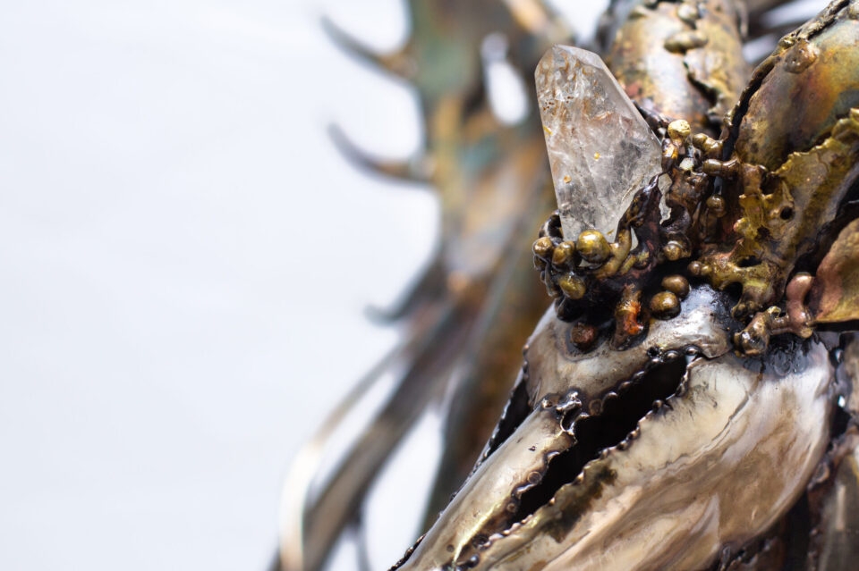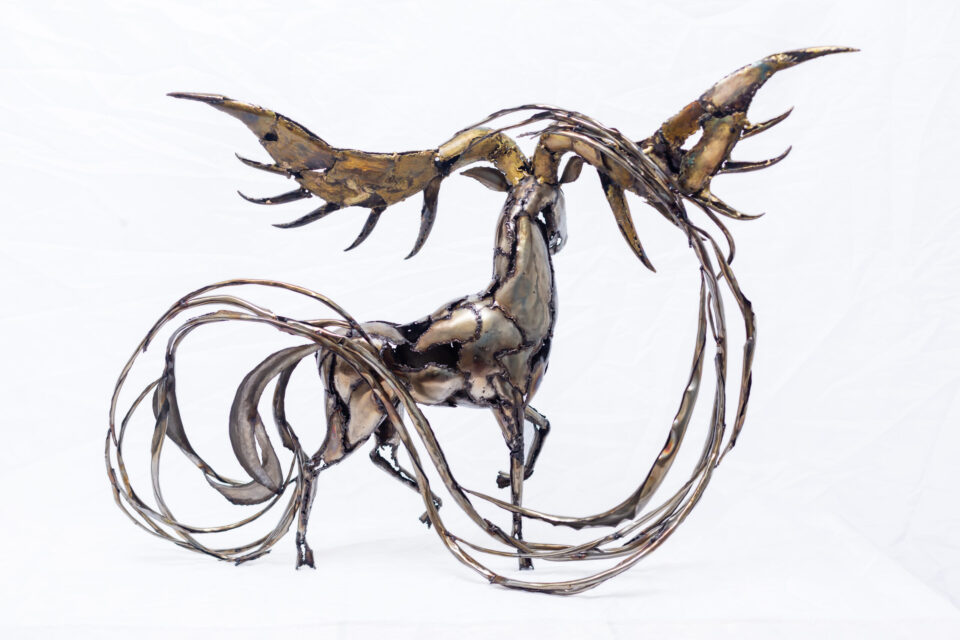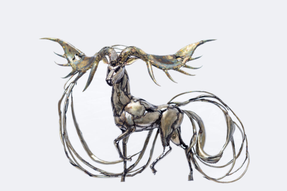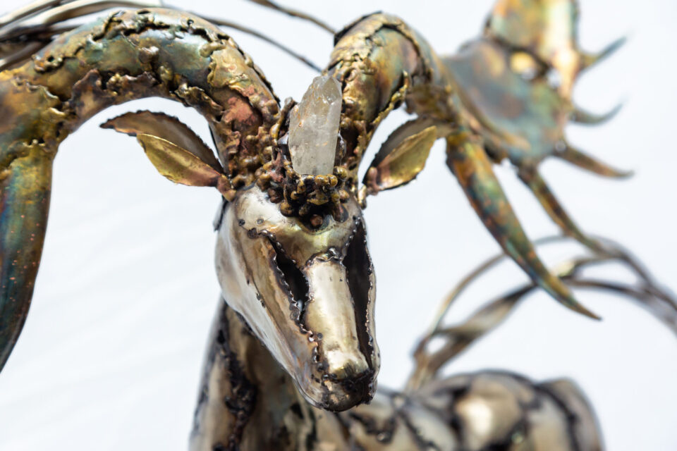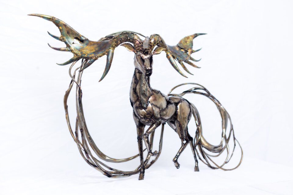 This mythical animal has Unique parts and Each part of the Enchanted Moose holds a special meaning. The six-pointed antlers symbolized harmony, reminding us of the importance of balance in our lives. The quartz crystal horn represented clarity of thought and the power of intuition, guiding us towards wise decisions. As for its long, tail that gracefully spread like the infinity symbol, it signified the eternal nature of life and the interconnectedness of all things. It reminded us that every action we take, every person we meet, and every choice we make has a lasting impact on the tapestry of existence. The Enchanted Moose possessed four ears, which symbolized deep listening and understanding. It taught us the value of truly hearing others, opening our hearts and minds to their perspectives, and fostering empathy and compassion. With horse-like legs, the Enchanted Moose embodied strength and resilience. It reminded us to stand tall and overcome obstacles with grace and determination, even in the face of adversity. This mythical creature's symbolism extends to our daily lives, teaching us to seek harmony, trust our intuition, embrace the interconnectedness of the world, listen deeply to others, and cultivate strength and resilience in all that we do. The Enchanted Moose reminds us that within ourselves, we possess the magic to navigate the enchanting journey of life. Dimensions: 58cm x 89cm x 19cm Materials: Stainless Steel | Brass | Quartz Crystal